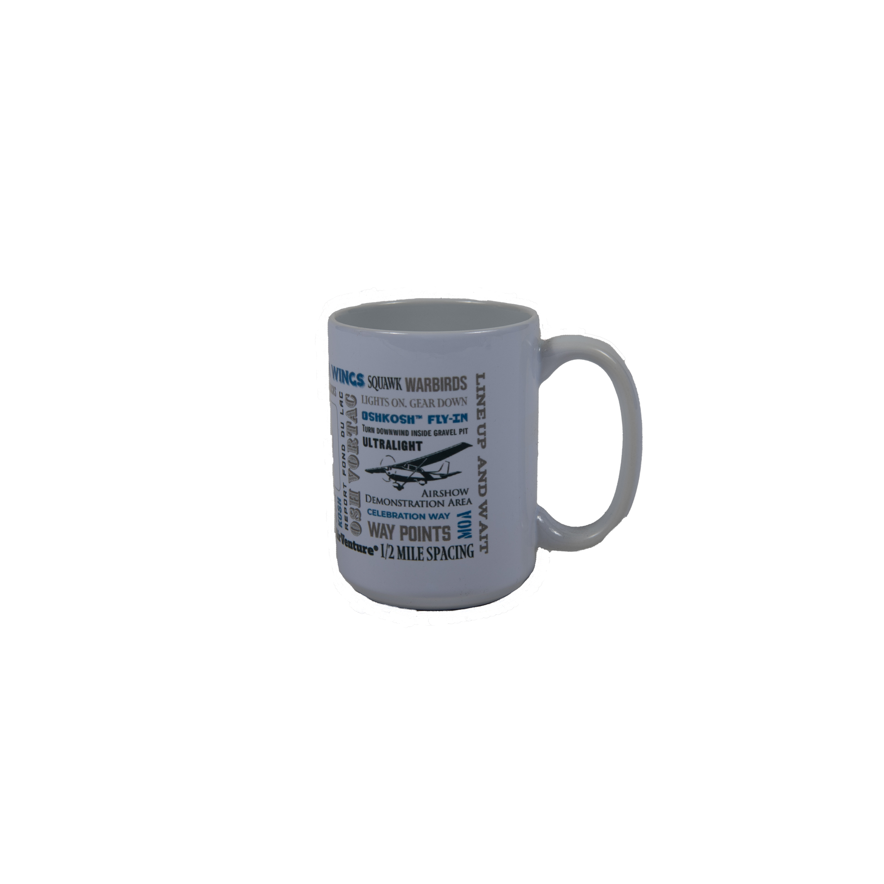 Fuel your day with a touch of aviation history! This 15 oz ceramic coffee mug is a must-have for pilots, aviation enthusiasts, and AirVenture fans alike. Featuring a dynamic design inspired by the legendary EAA AirVenture Oshkosh Fly-In, the mug showcases iconic aviation phrases, runway references, and waypoints familiar to anyone who's flown into the world's busiest airspace during the event.