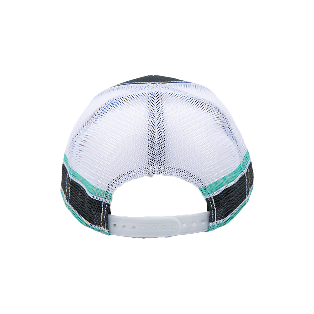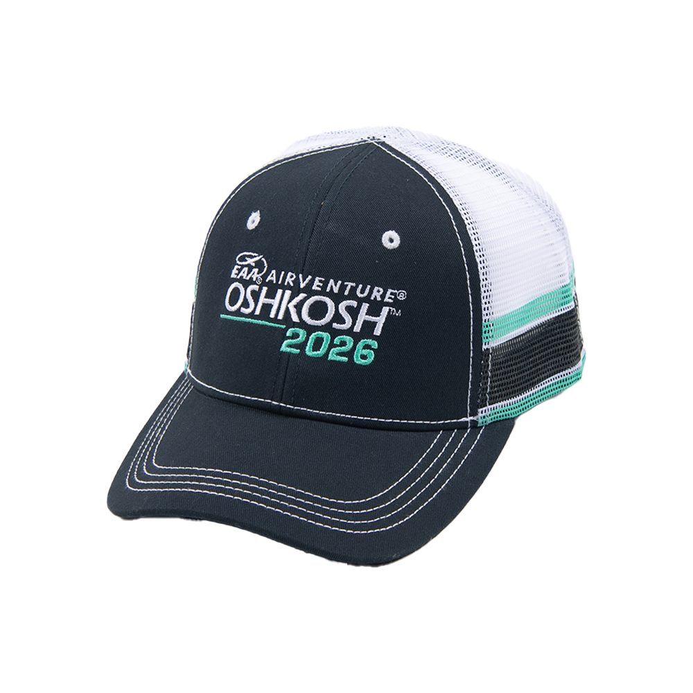 Cruise in style with this navy trucker cap featuring eye-catching printed turquoise and black side stripes that demand attention. The breathable mesh construction keeps you cool while the bold color combo brings serious personality to your AirVenture 2026 gear. Stand out and fly in color.