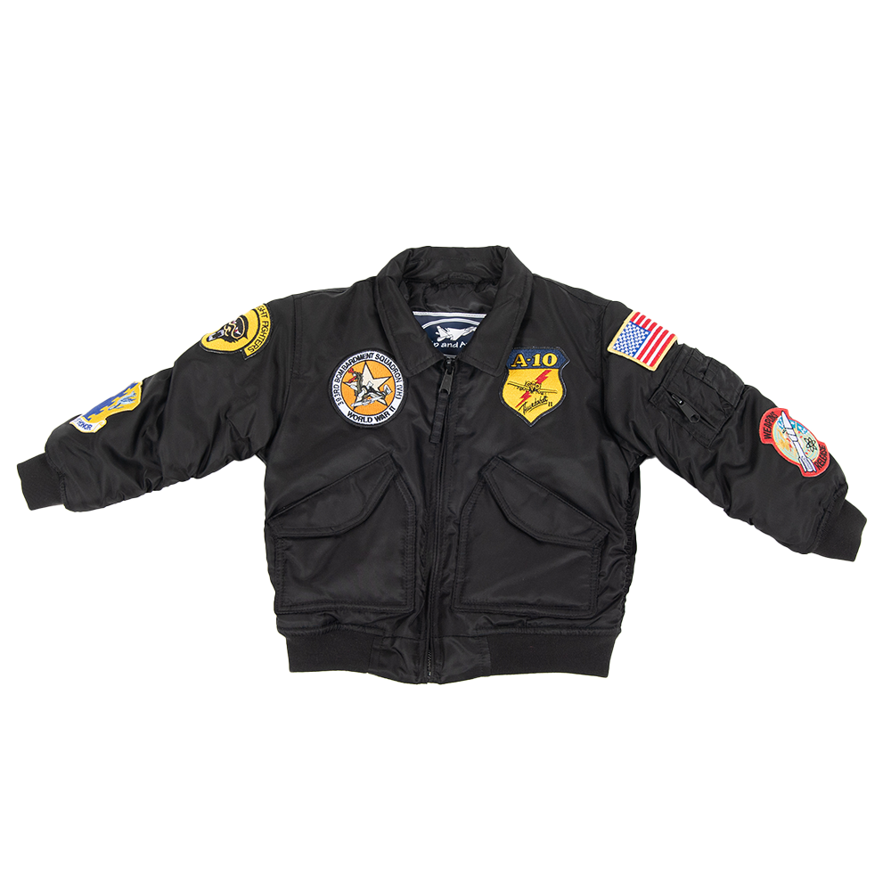 patches, two front pockets with Velcro covers, and a front wind flap.