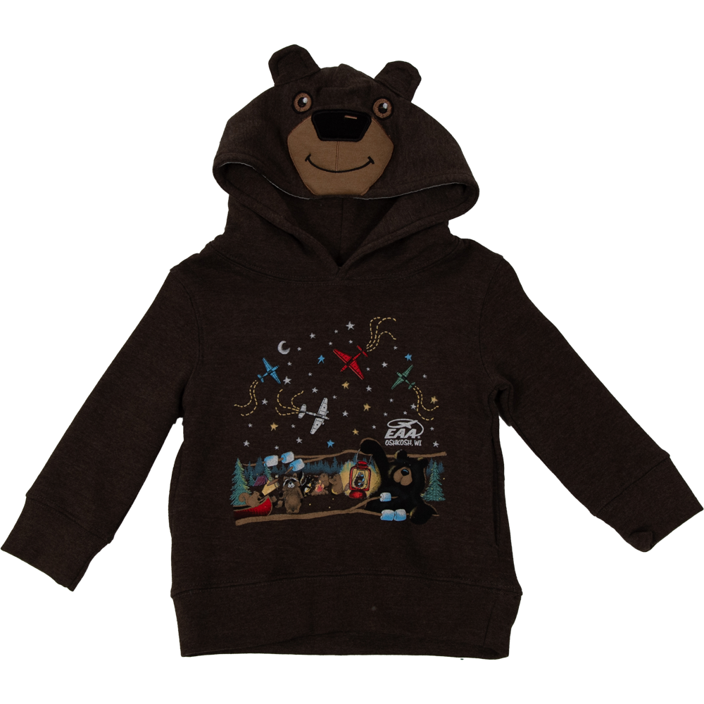 This cozy toddler hoodie from EAA brings playful adventure to chilly days. Made in a warm brown fabric, it features an adorable bear face on the hood complete with ears, making it as fun to wear as it is comfortable. The front design shows a whimsical campsite scene with woodland animals roasting marshmallows by the fire, while colorful airplanes soar overhead under a starry night sky. With its mix of aviation spirit and outdoor fun, this hoodie is perfect for little ones who love both the sky and the great outdoors.