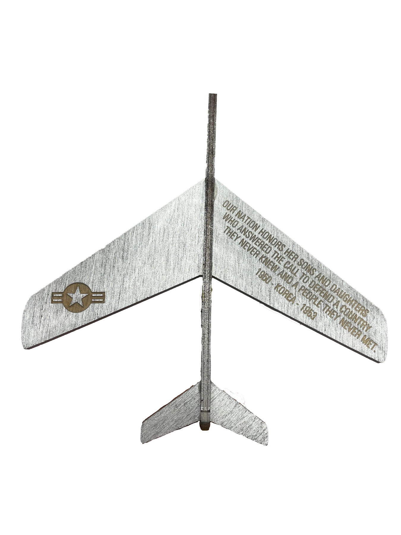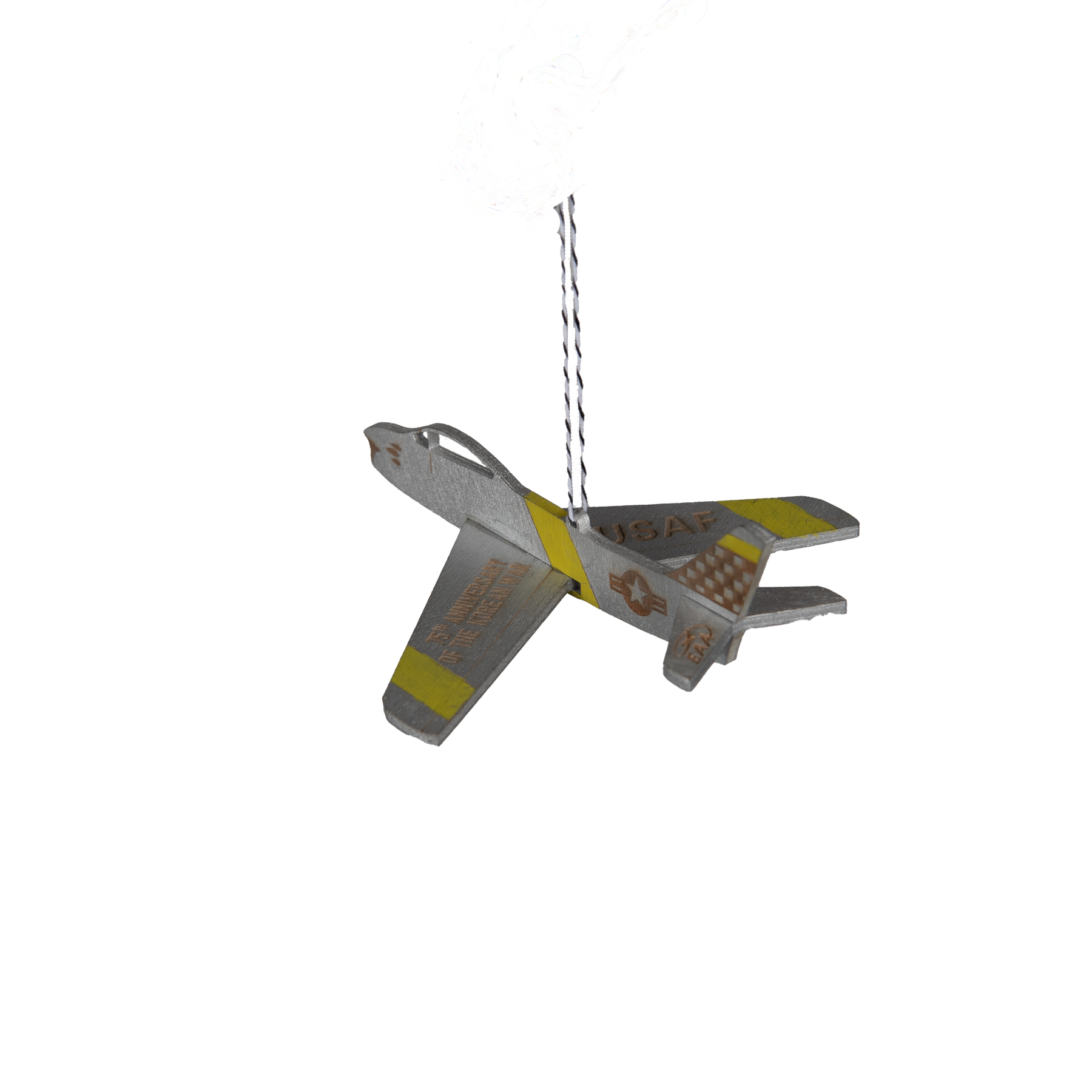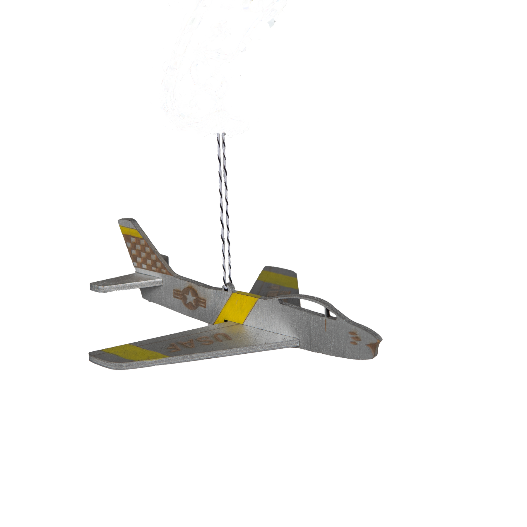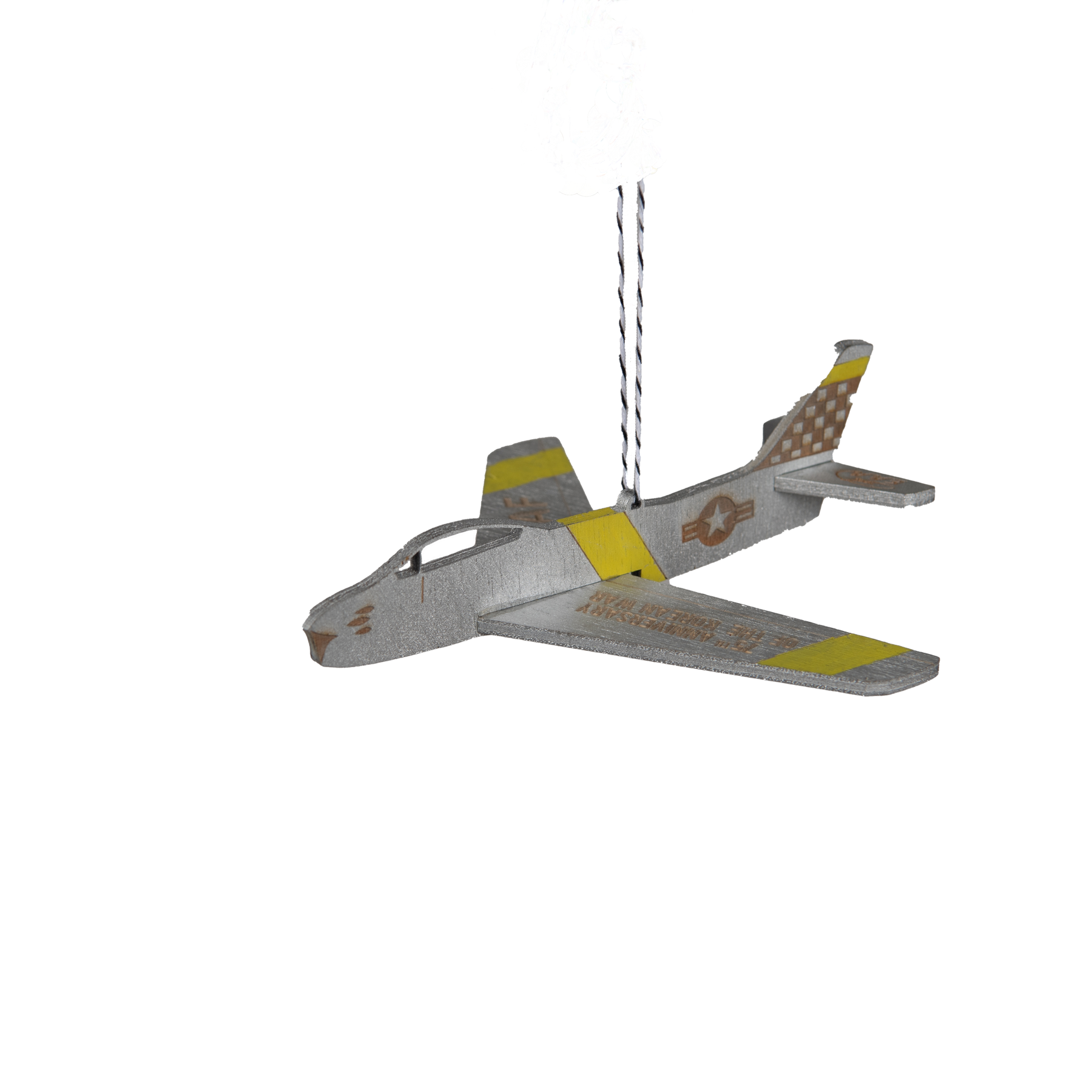 This handmade wooden ornament is a miniature replica of the F-86 Sabre, a famous American jet fighter from the Korean War era. Crafted with attention to historical detail, the ornament features the classic silver body with yellow and checkered tail markings, characteristic of U.S. Air Force aircraft of the time. The insignias, including the USAF roundel and text, are faithfully rendered, and the ornament is suspended by a colorful, twisted string, making it a perfect nostalgic tribute to mid-century aviation history. Ideal for collectors or military enthusiasts, it beautifully captures the spirit of the iconic jet.