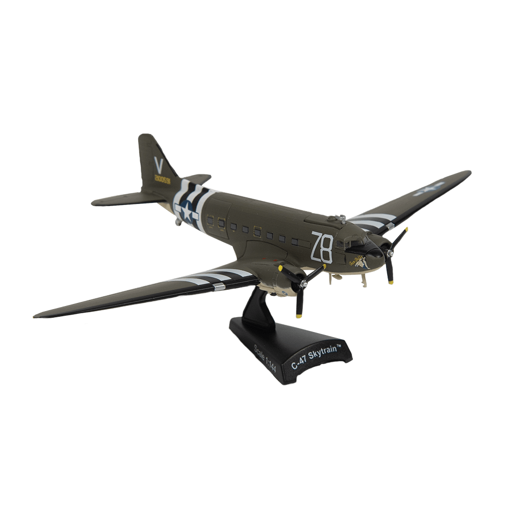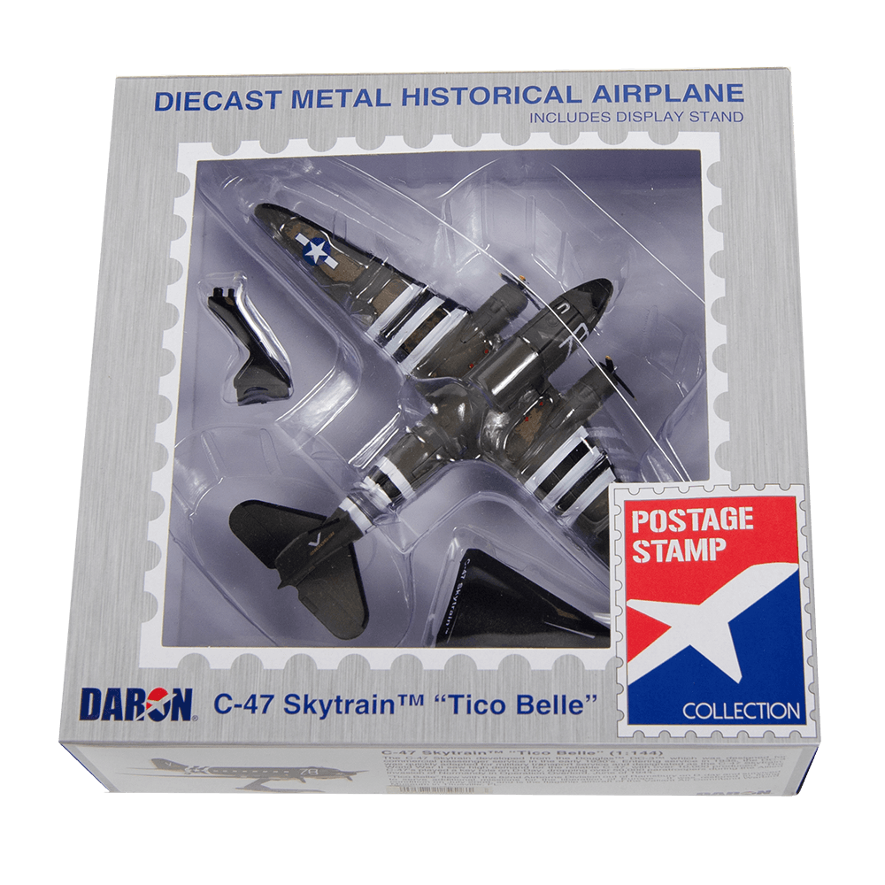 This Die-cast metal airplane model comes in 1:144 scale with plastic stand and is approximately 5 1/2 inches long with 7 3/4 inch wingspan. The C-47 Skytrain developed from the Douglas DC-3™ which was designed for commercial passenger service in the early 1930's. Entering service in 1935, the DC-3 was quickly adapted for military transport service and designated as the C-47 Skytrain. World War II saw high demand for the reliable C-47, with over 10,000 produced. The C-47's played a key role on D-Day, dropping over 50,000 paratroopers during the Allied invasion of Normandy in Operation Overlord, June of 1944. "Tico Belle" flew with the 82nd Airborne Division out of Ramsbury on D-day and survived to serve additional missions for the liberation of Europe. It was restored in flying condition on July 2009, and is the flagship aircraft of the Valiant Air Command Warbird Museum in Titusville, FL.
