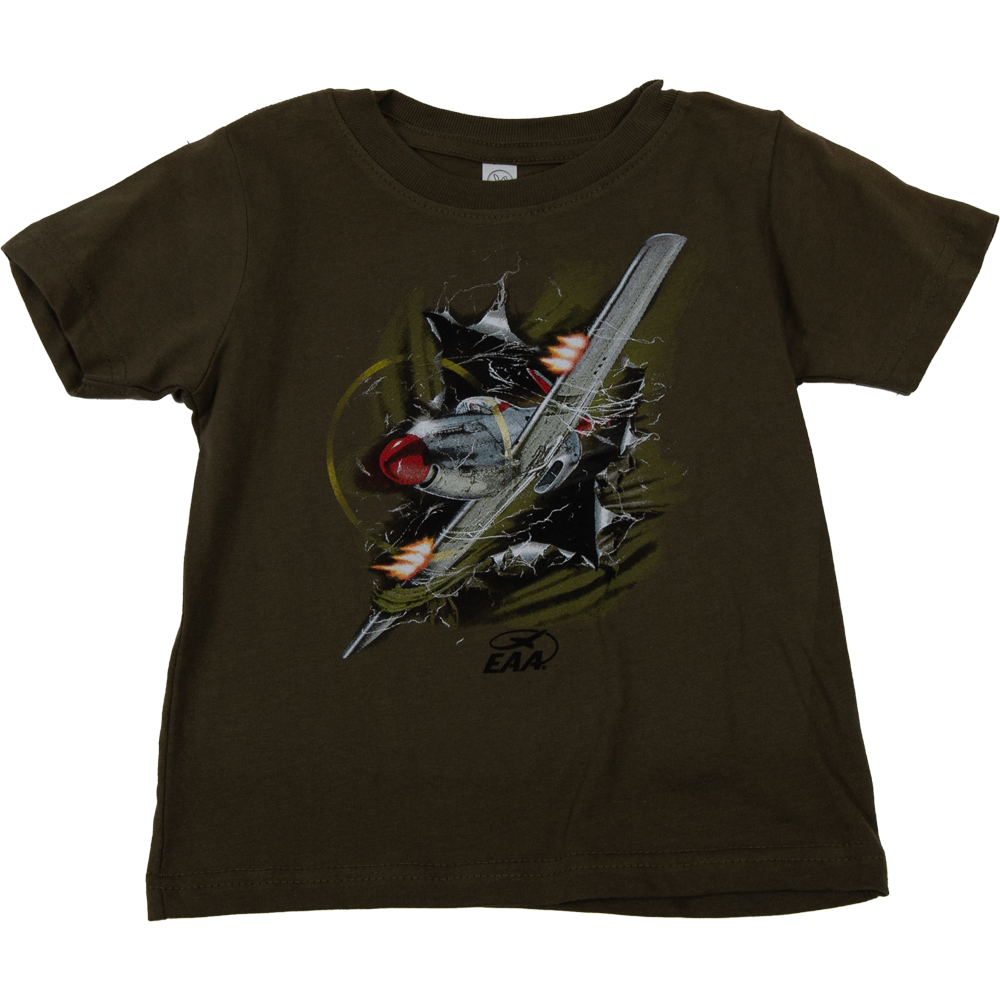 This toddler t-shirt captures the thrill of flight with a bold design featuring a vintage warbird bursting through the fabric in a powerful 3D-style graphic. The detailed artwork highlights the plane’s red nose and fiery motion, creating the illusion of speed and action. Made from 100% combed ring-spun cotton, it ensures all-day comfort while celebrating aviation heritage with the iconic EAA logo printed beneath the design.