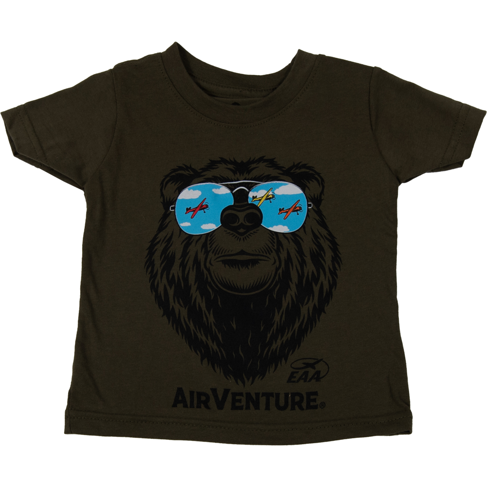 This EAA toddler graphic tee brings a fun aviation twist to a classic look with its bold bear graphic wearing reflective aviator sunglasses. In the lenses, colorful airplanes soar across a bright sky, perfectly capturing the spirit of adventure and flight. Soft, comfortable, and easy to wear, this shirt is a great way for little ones to show off their AirVenture style while staying cozy all day long. Made with 100% cotton.
