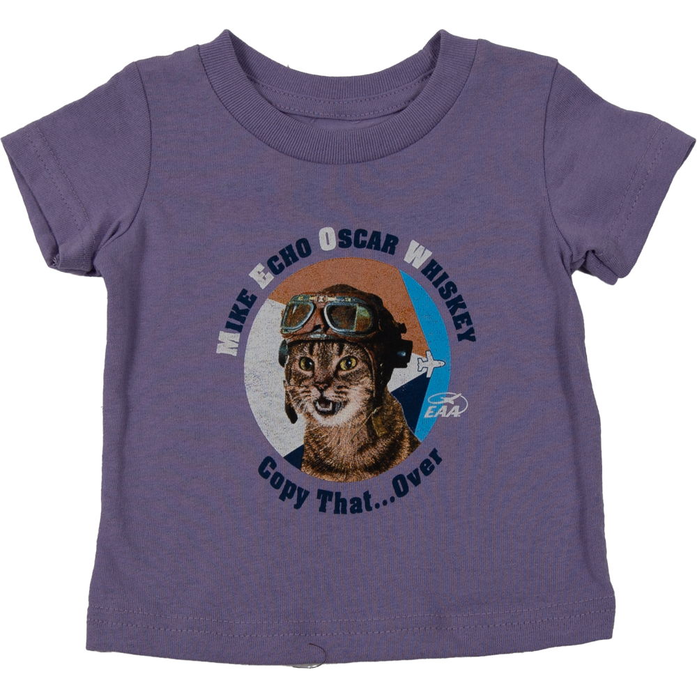 This playful baby t-shirt from EAA is designed to bring a smile with its fun aviation twist. Set on a soft 100% cotton red or purple fabric, the graphic features a determined aviator cat wearing classic flight goggles and a headset, surrounded by the phonetic alphabet spelling “Mike Echo Oscar Whiskey,” making it a whimsical nod to both flying and furry copilots. Comfortable and light, it’s a charming way for little ones to show off their love of aviation and adventure.
