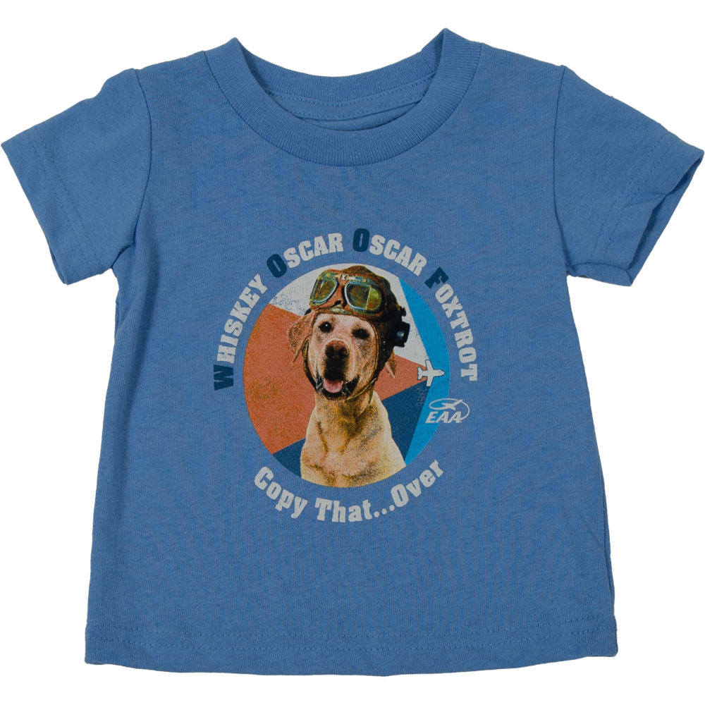 This toddler t-shirt from EAA is perfect for little aviation fans with a sense of humor. Made from 100% cotton in a cheerful sky-blue color, it features an adventurous pup wearing classic aviator goggles and a headset. Surrounding the playful design are the words “Whiskey Oscar Oscar Foxtrot,” spelling out W.O.O.F. in the phonetic alphabet. With its fun nod to flying and dogs, this shirt combines comfort with personality, making it a great choice for everyday wear or your next aviation outing.